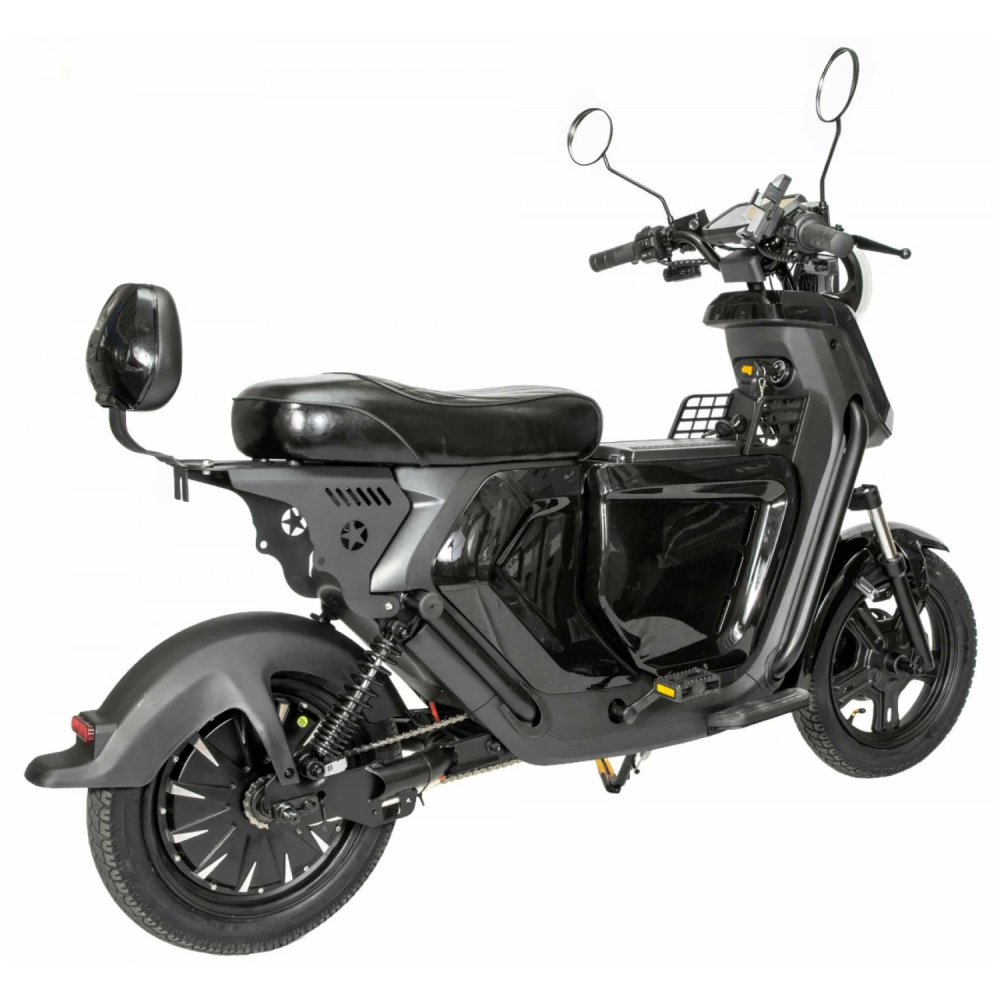 Передняя и задняя амортизации сделают вашу поезду более плавной, корпус модели – обеспечит ударостойкость, подножка – надёжность, гидравлические дисковые тормоза – быструю остановку, при спуске с горы, например. Также электроскутер подойдёт для перевозки двух людей.