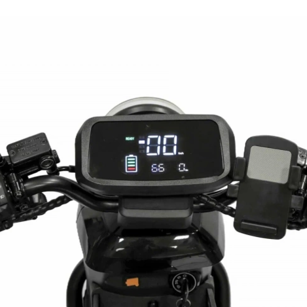 Ikingi Combo – стильный электроскутер с индивидуальным дизайном, оборудованный мощным мотор-колесом в 1000W, благодаря чему он способен достигать до 50 км/ч., за короткое время, и аккумулятором, на 40Ah, что позволит ездить, без подзарядки, до 80 км.